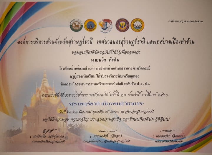 ชื่อผลงาน : เกียรติบัตรรางวัลเหรียญทอง การแข่งขันทักษะวิชาการ ระดับภาคใต้ ครั้งที่ 13 สุราษฎร์ธานี เมืองคนดีวิชาการ